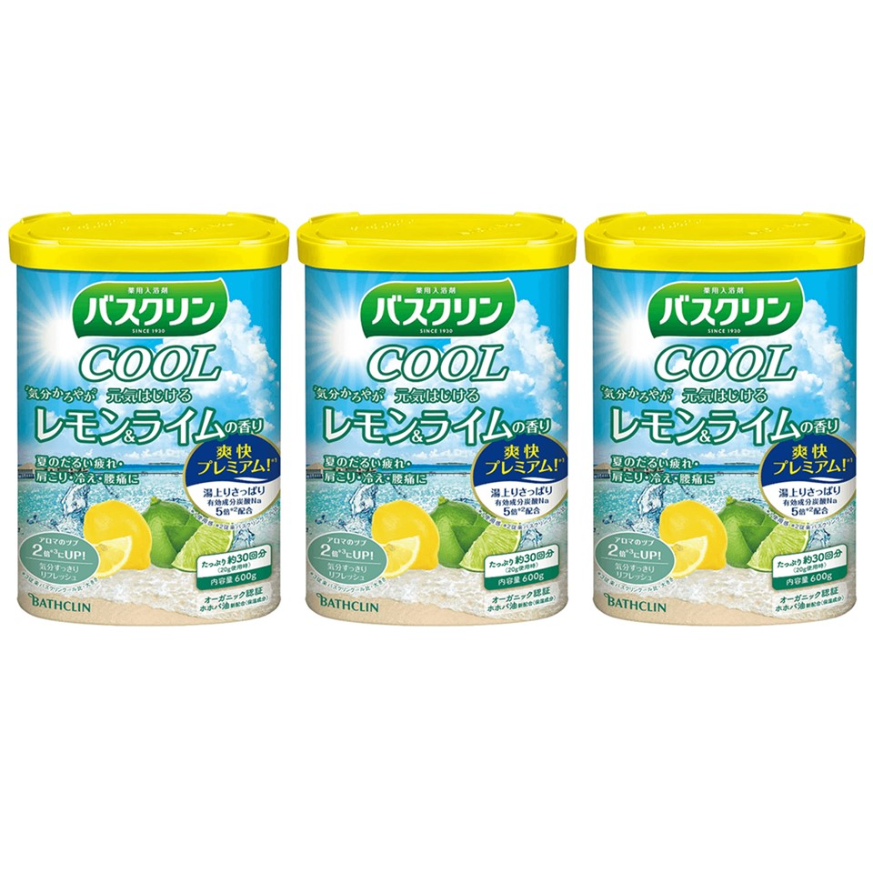 BATHCLIN เกลือผสมน้ำสำหรับแช่ตัว บาทคลิน คลีน คูล สูตรโซเดียม คาร์บอเนต โซเดียม ไบคาร์บอเนต และน้ำมะนาว กลิ่นมะนาวเลมอนและไลม์ ผลิตในประเทศญี่ปุ่น ชุดละ 3 กระปุก กระปุกละ 600 กรัม / BATHCLIN Bath Salt with Sodium Carbonate, Sodium Bicarbonate and Lime Juice - Clean Cool - Energizing and Refreshing - Lemon and Lime Scent - Made in Japan - Set of 3 Pieces - 3 x 600 G.