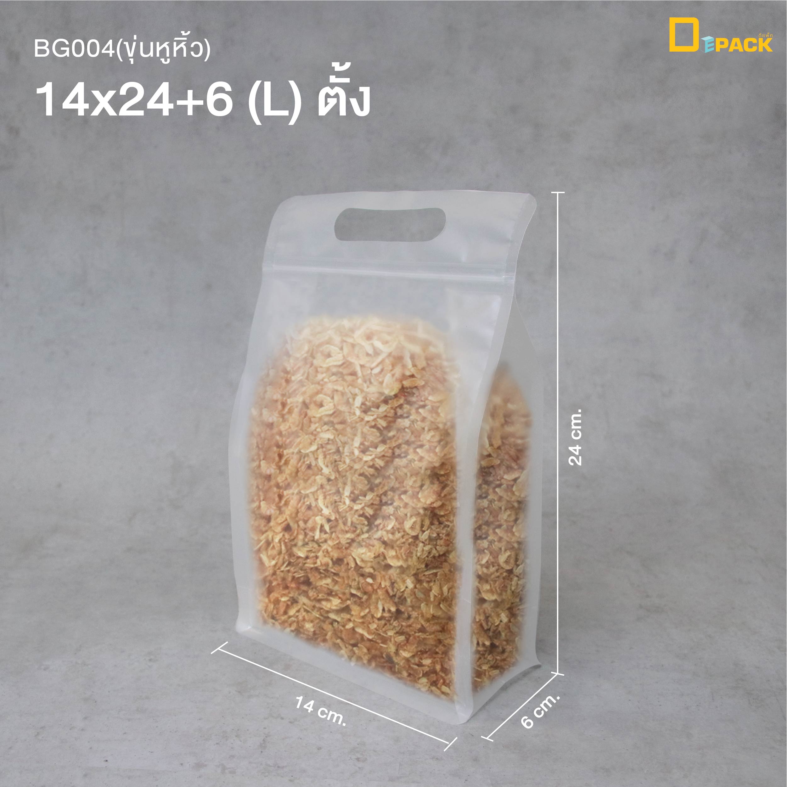 BG004(14x24+6)-TL(หูหิ้วตั้ง) ถุงซิปล็อคขุ่นหูหิ้ว ไซซ์ L (1 แพ็ค/ 20 ใบ) ตั้งได้ มองเห็นสินค้าด้านใน ป้องกันอากาศ ฝุ่นและความชื้น เหมาะสำหรับบรรจุอาหารแห้ง ขนม ผลไม้อบแห้ง ใบชา ของขวัญ เพื่อเพิ่มมูลค่าสินค้า ขนาด 14x24+6 ซม. ***ขนาดสินค้าอาจคลาดเคลื่อนประมาณ 4-5 มม. แล้วแต่ล็อตสินค้าที่นำเข้า