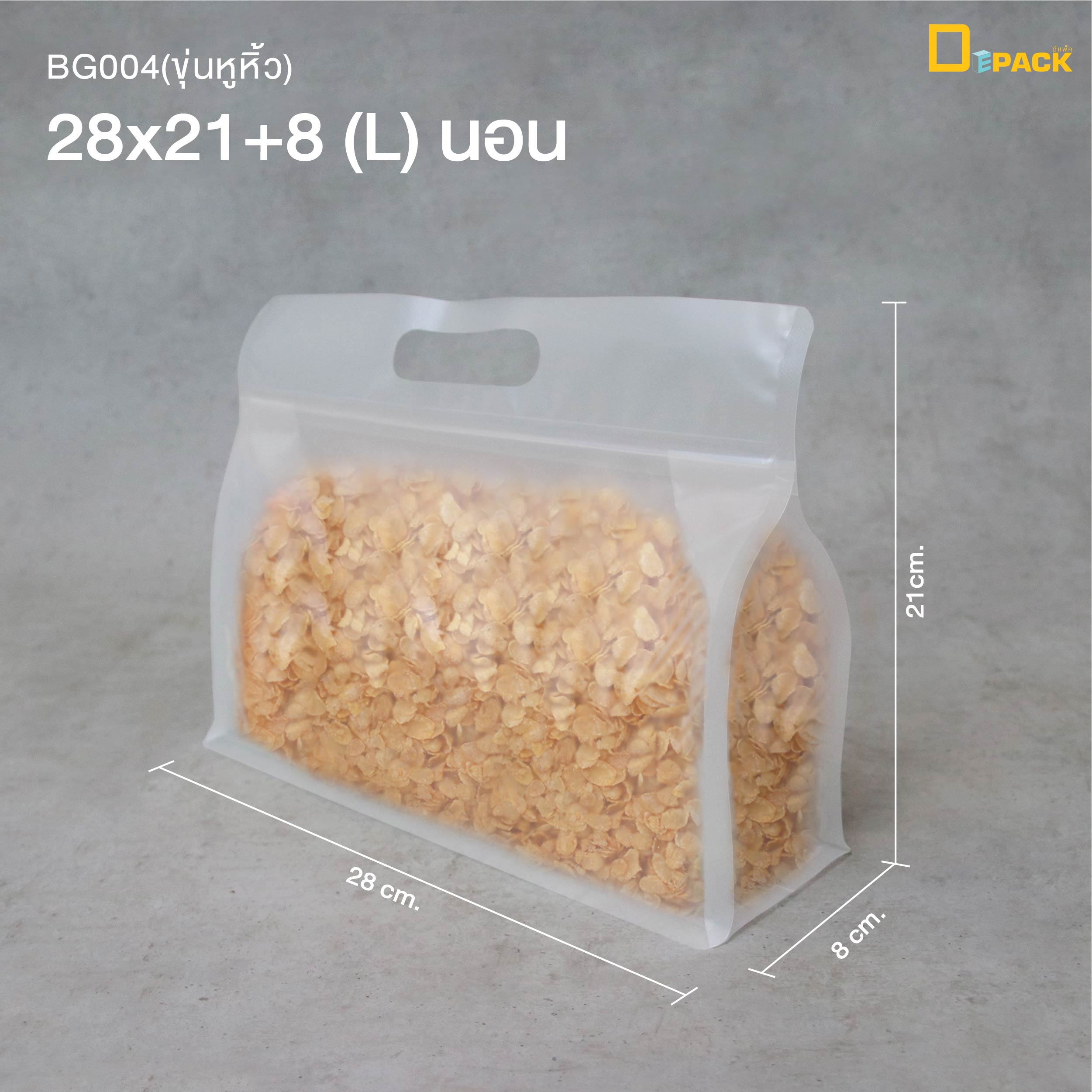 Depack BG004(28x21+8)-NL(หูหิ้วนอน) ถุงซิปล็อคขุ่นหูหิ้ว ไซซ์ L (1 แพ็ค/ 20 ใบ) ตั้งได้ มองเห็นสินค้าด้านใน ป้องกันอากาศ ฝุ่นและความชื้น เหมาะสำหรับบรรจุอาหารแห้ง ขนม ผลไม้อบแห้ง ใบชา ของขวัญ เพื่อเพิ่มมูลค่าสินค้า ขนาด 28x21+8 ซม. ***ขนาดสินค้าอาจคลาดเคลื่อนประมาณ 4-5 มม. แล้วแต่ล็อตสินค้าที่นำเข้า