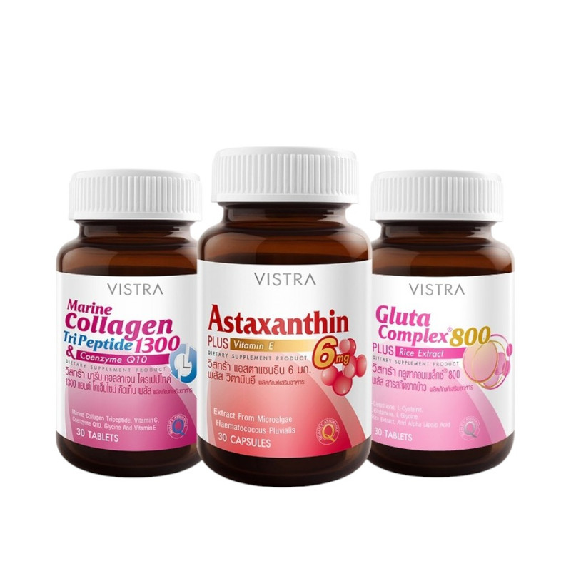 เซ็ทบำรุงผิว 1 เดือน วิสทร้า ASTAXANTHIN 6 MG PLUS VITAMIN-E+VISTRA Marine Collagen TriPeptide 1300 mg.+VISTRA Gluta 800