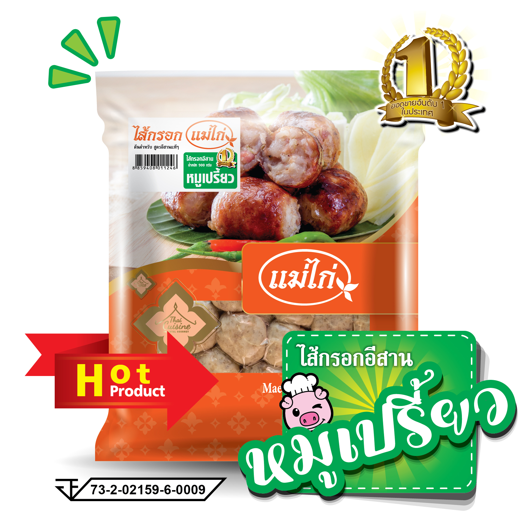 ผลิตภัณฑ์ไส้กรอกอีสาน ตราแม่ไก่ น้ำหนัก 900 กรัม/ แพ็ค ส่วนประกอบ : เนื้อหมู, เนื้อไก่, มันหมู, ไส้หมู, ข้าวสุก, เครื่องเทศ, เครื่องปรุงรส เลขสารระบบ : 73-2-02159-6-0009