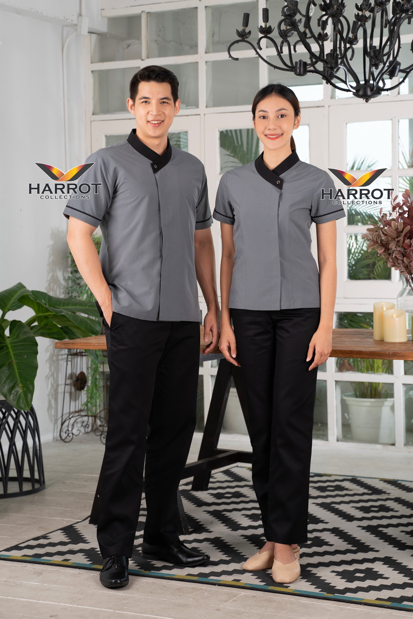 เสื้อพนักงานเสิร์ฟ เสื้อเสิร์ฟ เสื้อเชิ้ต เสื้อฟอร์ม เสื้อพนักงานต้อนรับ ชุดพนักงานเสิร์ฟ คอป้าย สีเทา-ดำ (SHW1703) ชนิดผ้า : ผ้าไมโครทัชลาน (polyester 100%) แขนสั้น , คอป้าย สาปซ่อน , ชายเสื้อแบบตรง ผ่าด้านข้าง แต่งปกคอและปลายแขนสีดำ Size S-XL (ผู้หญิง) และ S-XL (ผู้ชาย) (size อื่นๆ สั่งทำได้ค่ะ)