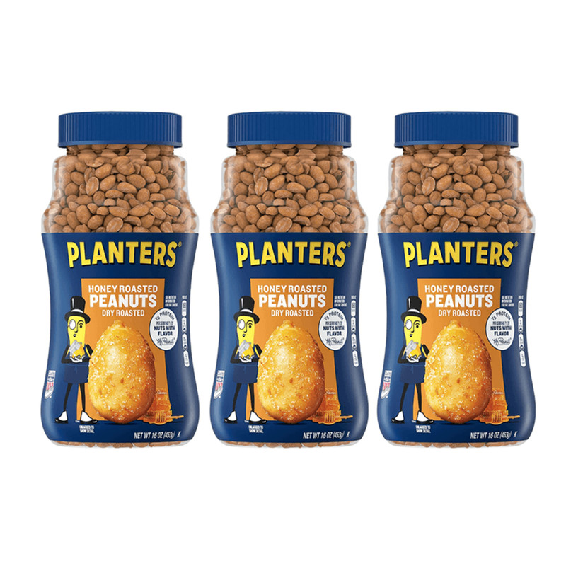 PLANTERS ถั่วลิสงอบ เคลือบน้ำผึ้งและเกลือทะเล แพลนเตอร์ ดราย ฮันนี่ โรสเต็ด พีนัทส์ ผลิตในสหรัฐอเมริกา ชุดละ 3 ขวด ขวดละ 453 กรัม / PLANTERS Dry Honey Roasted Peanut with Honey Coating and Sea Salt - Made in U.S.A - Set of 3 Pieces - 3 x 453 G.
