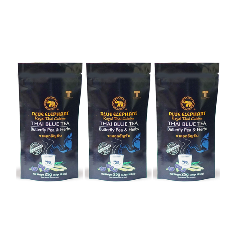 BLUE ELEPHANT เครื่องดื่มชาดอกอัญชัน ตะไคร้ ใบเตย บลู เอเลเฟ่นท์ ดื่มได้ทั้งร้อน และเย็น ปราศจากสี วัตถุเจือปนอาหาร ผงชูรส และวัตถุกันเสีย ชุดละ 3 ซอง ซองละ 25 กรัม / BLUE ELEPHANT Royal Thai Cuisine - Mixture of Butterfly Pea Flower, Lemongrass and Pandan Leaves - Hot and Cold Drink - No Color, Food Additive, MSG, and Preservative - Halal - Product of Thailand - Set of 3 Packs - 3 x 25 G. - ผลิตในประเทศไทย - ทำจากดอกอัญชัน ตะไคร้ ใบเตย - ใช้เป็นเบสสำหรับค็อกเทล และเครื่องดื่มเพื่อเพิ่มความสดชื่น - เข้ากันได้ดีกับน้ำมะนาว - กลิ่นหอมจากตะไคร้ และใบเตย - ผสมน้ำร้อน ชงดื่ม ดื่มได้ทั้งร้อน และเย็น - ปราศจากสี วัตถุเจือปนอาหาร ผงชูรส และวัตถุกันเสีย - กระบวนการผลิตตามมาตรฐาน HACCP - ฮาลาล - ดื่มได้ทั้งร้อน และเย็น - บรรจุซอง พกพาสะดวก - ถุงบรรจุ 10 ซอง ซาเชต์ ซองละ 2.5 กรัม - เพียงละลายในน้ำร้อน ข้อมูลบนเว็บไซต์นี้มีวัตถุประสงค์ในการให้ข้อมูลพื้นฐาน