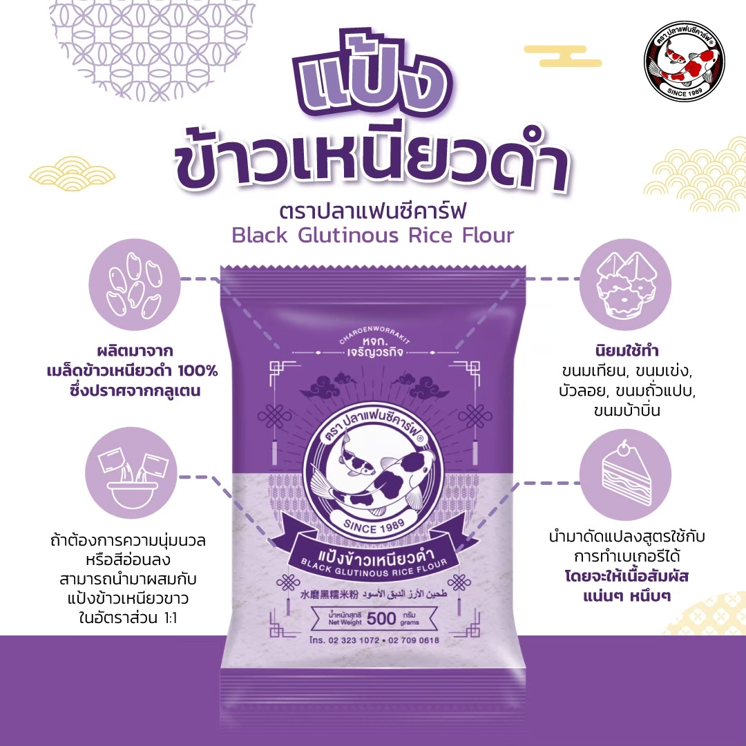 With our special techniques in the production process combined with the finest selection of black glutinous seeds, Fancy Carp Brand Black Glutinous Rice Flour gives softer and smoother texture to food. Its distinguish smell and color make the dish uniquely delectable.
