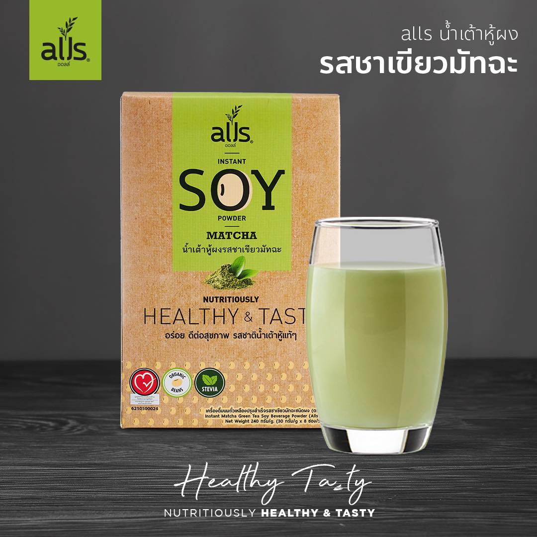 alls soy น้ำเต้าหู้ จากธรรมชาติ เครื่องดื่มนมถั่วเหลืองปรุงสำเร็จรสชาเขียวมัทฉะ ชนิดผง (ตราออลส์) ถั่วเหลืองออร์แกนิค ที่ไม่มีการตัดแต่งพันธุกรรม ปลูกโดยวิถีอินทรีย์ ไม่มีการปนเปื้อนของสารเคมีในทุกขั้นตอน ทำให้ผู้บริโภคได้รับสารอาหารที่มีประโยชน์สูงกว่าอาหารทั่วไป alls น้ำเต้าหู้ผง ถั่วเหลืองออร์แกนิค 1 ซอง เท่ากับ 130 แคลอรี่ เท่านั้น แค่ทาน alls แทนมื้อเช้า หรือ มื้อเย็นช่วยลดแคลอรี่ อิ่มสบายท้อง - LOW CALORIE แคลอรีต่ำ - ORGANIC SOY BEANS ถั่วเหลือง ออร์แกนิค - CHOLESTEROL FREE ไม่มีคอเลสเตอรอล - NO TRANS FATS ไม่มีไขมันทรานส์ - 100% PLANT PROTIEN โปรตีนจากพืช 100% - NO PRESERVATIVES ไม่ใส่สารกันบูด - NON GMO ไม่ดัดแปลงพันธุกรรม - STEVIA ใช้สารสกัดจากหญ้าหวานแทน