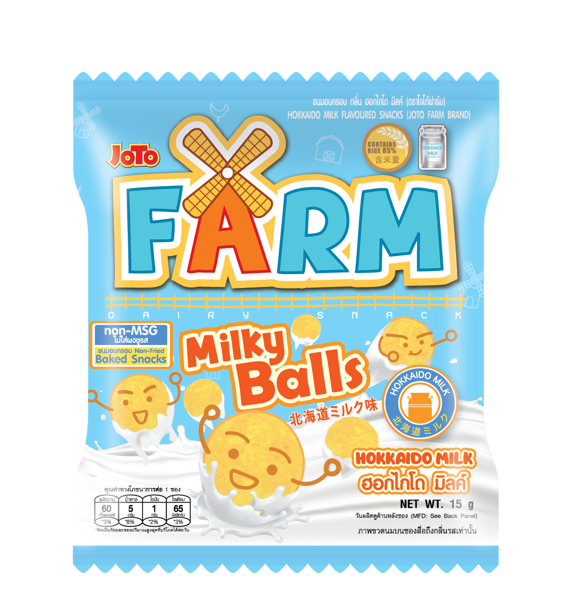 ขนมโจโต้ฟาร์ม ไม่ใส่ผงชูรส ขนาดบรรจุ 12 กรัม (แพ็คละ 12 ซอง) ขนมอบกรอบ ตราโจโต้ฟาร์ม ผลิตจากข้าว และข้าวโพดอย่างดี ผ่านการอบจนกรอบ และปรุงรสโดยไม่ใช้ส่วนผสมที่มีผงชูรสเป็นส่วนประกอบ รสชาติหอมอร่อยของโจโต้ฟาร์มจึงเป็นรสชาติที่เข้มข้นมาจากวัตถุดิบอย่างแท้จริง รสฮอกไกโดมิลค์ : จากส่วนผสมของนมแท้ๆ ผ่านการปรุงรสอย่างดี เพื่อให้รสชาติที่ หอม มัน อร่อย ไม่เหมือนใคร