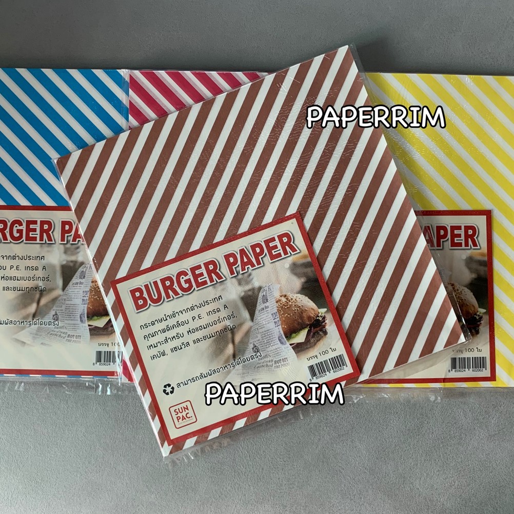 กระดาษห่อเบอร์เกอร์ลายทาง - ขนาด 12x12 นิ้ว - บรรจุ 100 ใบ/แพ็ค - ใช้ห่อเบอร์เกอร์ ห่อขนม หรือรองจานได้ - บรรจุแพ็คละ 100 ใบ