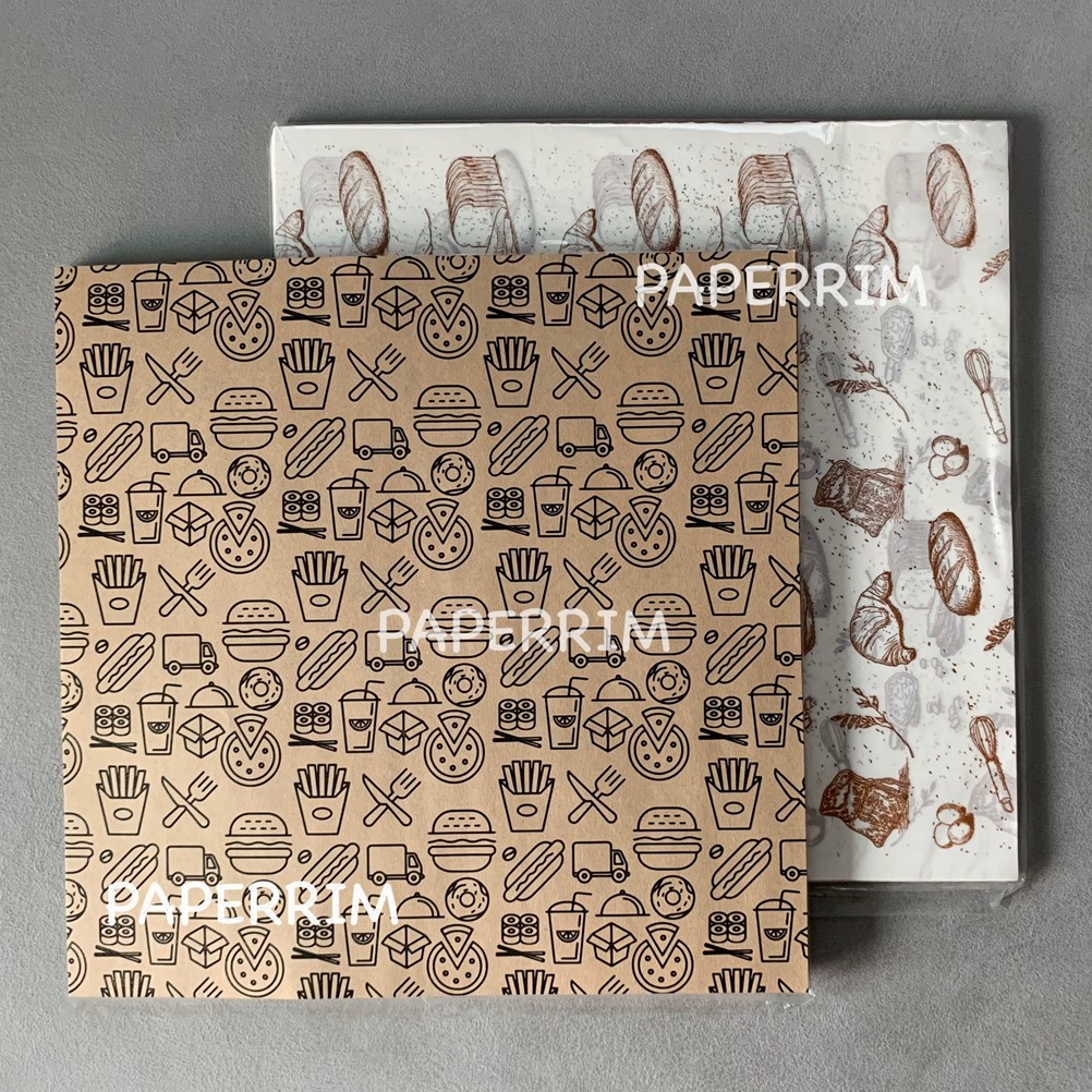 Paperrim กระดาษห่อขนม/เบอร์เกอร์ สีน้ำตาล ลายอาหาร ขนาด 12 x 12 นิ้ว บรรจุ 100 ใบ/แพ็ค